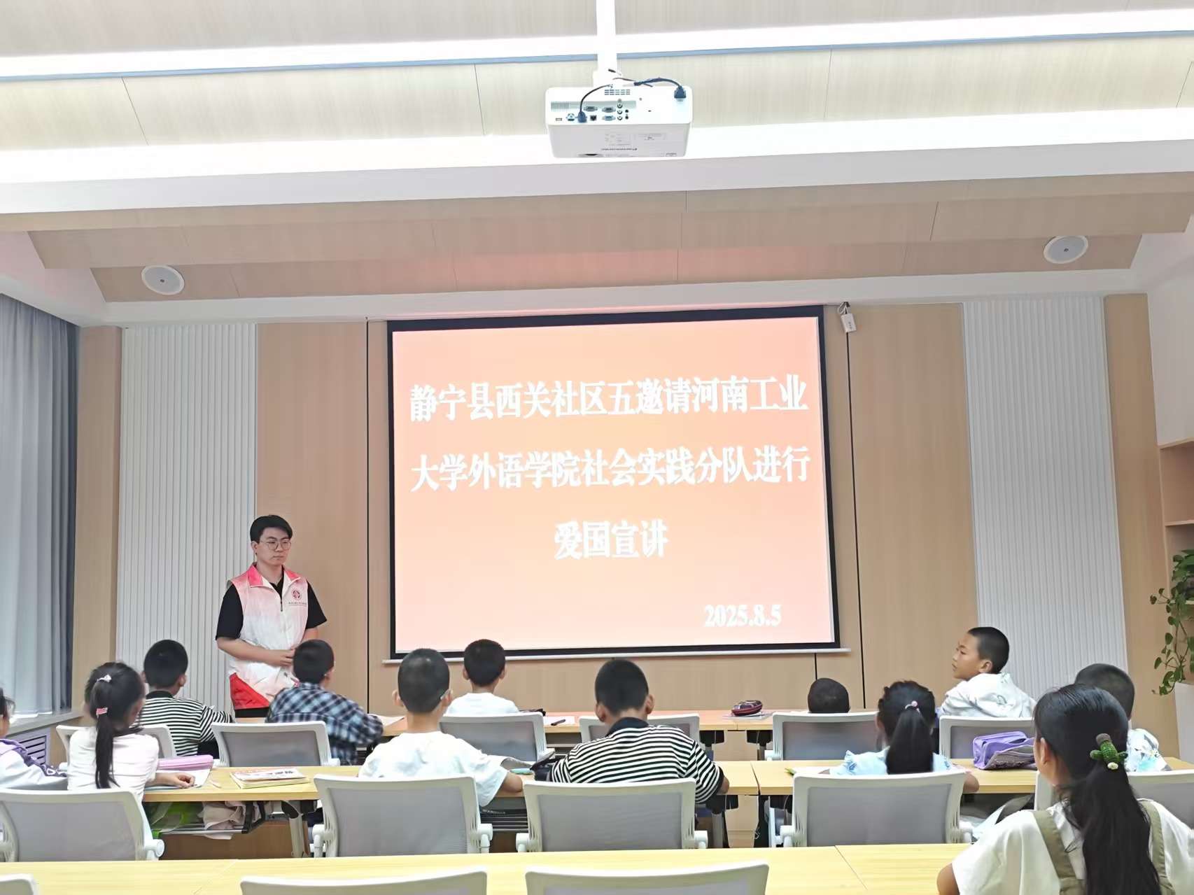 甘肅平?jīng)觯?025年8月5日——為深入貫徹落實習(xí)近平總書記關(guān)于青年工作的重要思想,引導(dǎo)和幫助廣大青年學(xué)生在與現(xiàn)實相結(jié)合的“大思政課”中“受教育、長才干、作貢獻”,河南工業(yè)大學(xué)外語學(xué)院社會實踐小分隊走進甘肅省平?jīng)鍪徐o寧縣,在城關(guān)鎮(zhèn)西關(guān)社區(qū)居民委員會開展了一場別開生面的愛國主義教育活動,為當(dāng)?shù)匦W(xué)生帶來了一堂意義非凡的愛國啟蒙課。