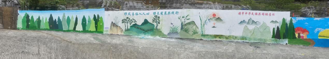下鄉期間“一方凈水”團隊走進鄉村開展墻繪創作活動,以畫筆為媒踐行綠色發展理念、厚植中華民族共同體意識。隊員們選取村內一片總長為60平方米的側墻,精心繪制多幅主題作品,以綠水青山為底色,勾勒出了一幅幅意境悠遠、筆墨靈動的生態畫卷,動物、林海與光、生態農園交相輝映,生動詮釋綠色發展內涵!