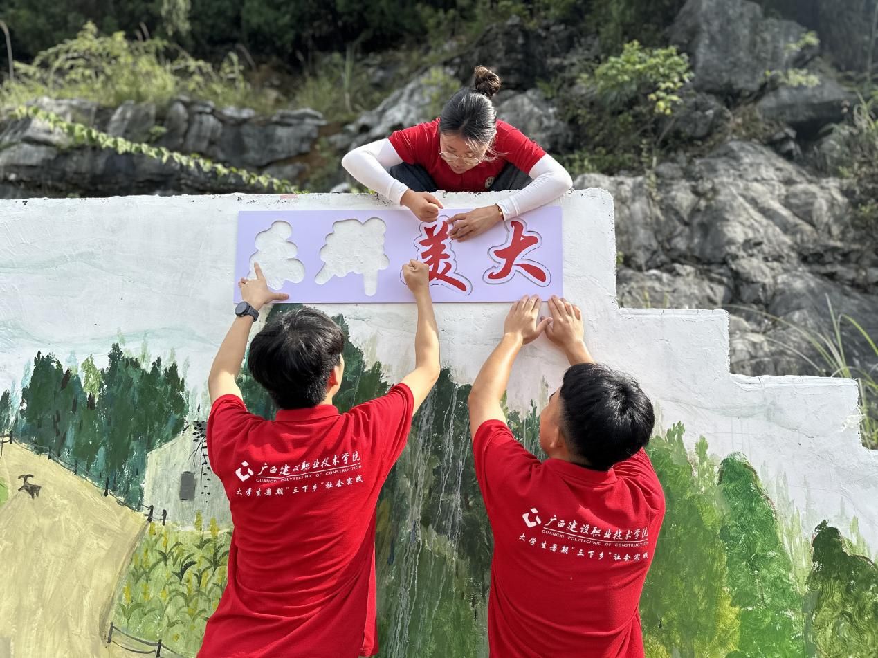 圖為實踐團成員在為墻繪粘貼文字(通訊員李兆健)