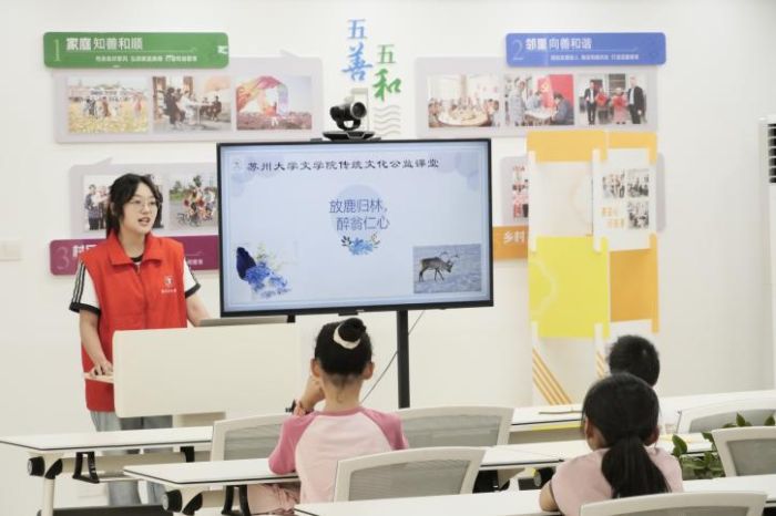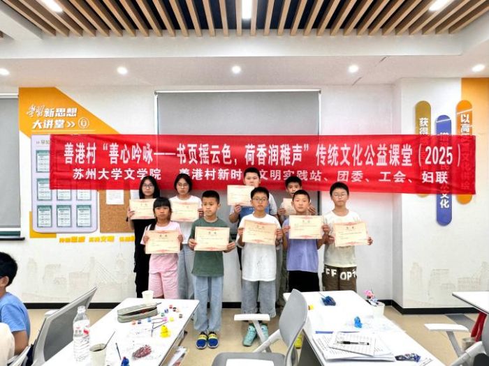 當最后一張獎狀送到孩子手中,蘇州大學文學院“書頁搖云色,荷香潤稚聲”傳統文化公益課堂團隊的五日線下實踐,在甲骨文中“善”字的溫潤筆觸里落下了句點。