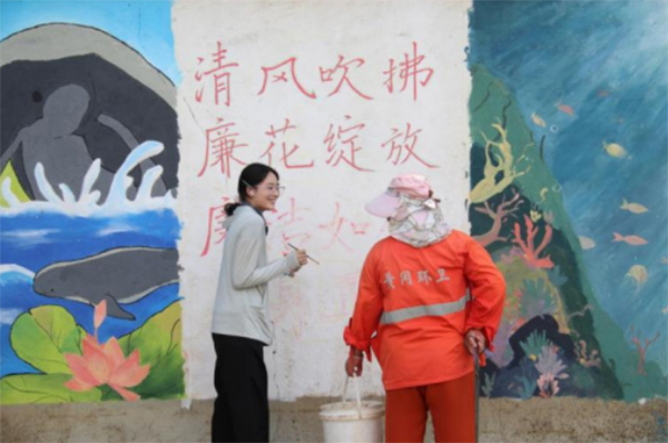 活動執行期間,當地日間氣溫持續攀升至35℃以上,高溫導致顏料易干結,給戶外創作帶來不小挑戰。志愿者們無懼酷暑,堅持露天作業;夜幕降臨后,又借著燈光細致打磨細節,同時克服蚊蟲侵擾的困擾。暖心的是,社區環衛工主動送來水桶等工具提供支持,形成公益行動與居民互動的溫情場景,讓善意在協作中不斷傳遞。