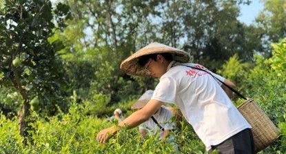 圖為青島大學(xué)外語(yǔ)學(xué)院“湘西莓茶香,青春助農(nóng)興”社會(huì)實(shí)踐團(tuán)成員采摘莓茶