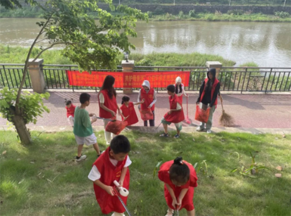 除室內課程外,十余名兒童在志愿者帶領下,將課堂搬至凌江河道岸邊,開展“同飲一江水,共護母親河”環保實踐活動。志愿者與兒童沿河道清理垃圾,孩子們分組行動,手持夾子、垃圾袋,在志愿者協助下清理草叢、石縫中的廢棄物。志愿者則示范分類方法,將可回收物與有害垃圾分裝,全程護航安全。