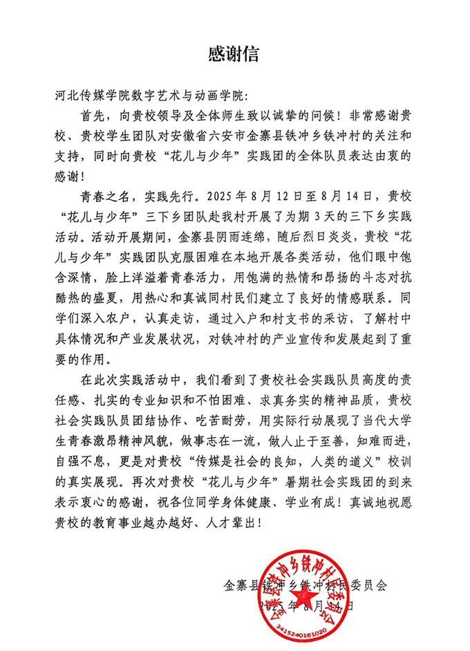 離別時,鐵沖村村委會向實踐團送上感謝信,肯定其工作成效。此次“三下鄉”活動,實踐團既記錄鄉村變遷,又錘煉自身本領,為鄉村振興注入青春力量,也為青年學生扎根基層、服務社會樹立典范。