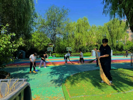 實踐活動期間,實踐團成員早早的來到校園內(nèi),在老師的引導下實踐團成員手持掃帚、簸箕,分工協(xié)作,認真清理落葉、雜物。盡管烈日炎炎,卻絲毫未減熱情。經(jīng)過努力,操場環(huán)境煥然一新。