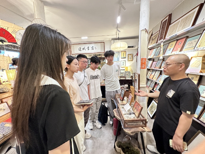 帶著對基層治理的鮮活感悟,實踐團隨后走進彌漫著書香的邊城書店。書店主理人王軍為隊員們展開了一幅跨越時空的運河文化交流畫卷——他輕輕捧著一本從韓國購回、帶有韓文批注的明代《詩經(jīng)》珍本,緩緩說道:“運河曾是中華文明輻射東亞的‘文化大動脈’,這些留存至今的古籍,就是最有力的物證。”當成員程婧堯好奇詢問“古籍保護如何‘活’在當下”時,王軍先是展示了正在修復的古籍殘頁,隨后又拿出據(jù)此開發(fā)的精美文創(chuàng)產(chǎn)品。“老祖宗的技藝不能只躺在庫房里蒙塵,只有為它注入時代活力,讓年輕人真正喜愛,才是對文化最好的傳承。”隊員們親手觸摸著這些承載著古今對話的泛黃紙張,對大運河促進文明交融的歷史價值,有了更為真切的體悟。書店內(nèi),修復師專注工作的身影與古籍散發(fā)的獨特墨香交織,讓隊員們深刻感受到守護文化根脈的匠心與堅守。