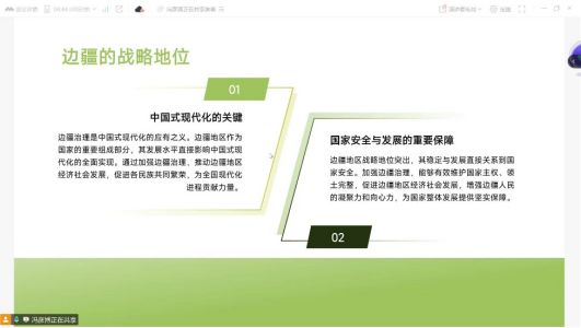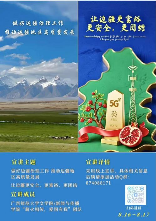 為深入學習宣傳貫徹習近平總書記關于邊疆治理的重要論述,引導廣大青年學生深刻認識邊疆地區在全面建設社會主義現代化國家中的重要作用,2025年8月16日至17日,廣西師范大學“薪火相傳,愛國有我”實踐團充分發揮網絡平臺優勢,通過騰訊會議、微信公眾號、抖音等渠道,成功舉辦了兩場以“邊疆治理與高質量發展”為主題的線上宣講活動吸引了眾多校內外師生及社會公眾在線參與,反響熱烈。