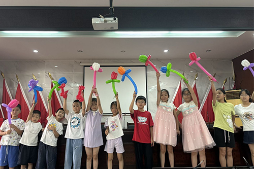 7月10日聯歡會現場,志愿者與孩子們共同創作五彩氣球。一雙雙小手在大學生引導下將普通氣球扭結成小狗、花朵等生動造型,創意飛揚中映照童真想象力。隨后的茶話會上,志愿者們精心準備的水果零食成為情感催化劑。孩子們圍繞在“大朋友”身邊,分享實踐期間的閱讀感悟與手工成果,暖意融融的場景彰顯長期陪伴建立的深厚信任。一張張合影定格了不舍的笑臉,“每周線上共讀”的約定更將陪伴延伸至活動之外,為長效教育幫扶機制注入溫暖注腳。
