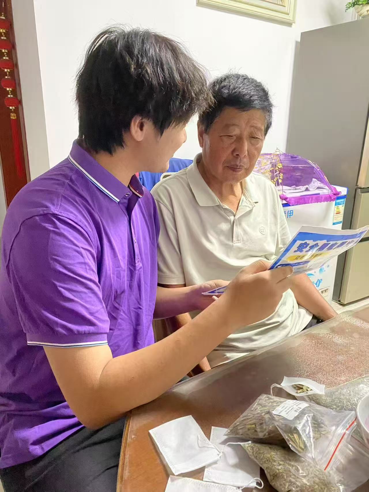 | (圖為7月23日,“銀齡筑夢臻關(guān)愛,杏林護煦煥晴暉”團隊成員倪想為漕河社區(qū)王爺爺介紹用電用火的注意事項。翟蘇星供圖) |