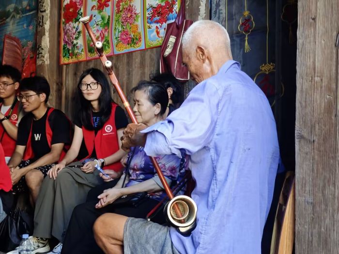 (圖為實踐團成員向村民學習草鞋制作過程 陸遠莉攝) 實踐團在熊村戲臺偶遇村民組織的"熊村合唱團"正在排練。隨著二胡的悠揚前奏響起,老人們向隊員們熱情招手。起初拘謹的大學生們很快被《好一朵茉莉花》的歡快旋律感染,一位銀發阿婆將手寫的桂柳話歌詞遞到隊員手中:"莫要怕走音,開心最要緊!"隨后,實踐團與熊村老年合唱團的交流在歌聲中達到高潮。當白發歌者用方言唱起原始版"好一朵茉莉花"時,大學生們以藝術院校改編的"好一朵美麗的茉莉花"相和,兩種唱腔在古戲臺上交織碰撞——前者帶著泥土芬芳的質樸,后者透著朝氣青年的華彩。