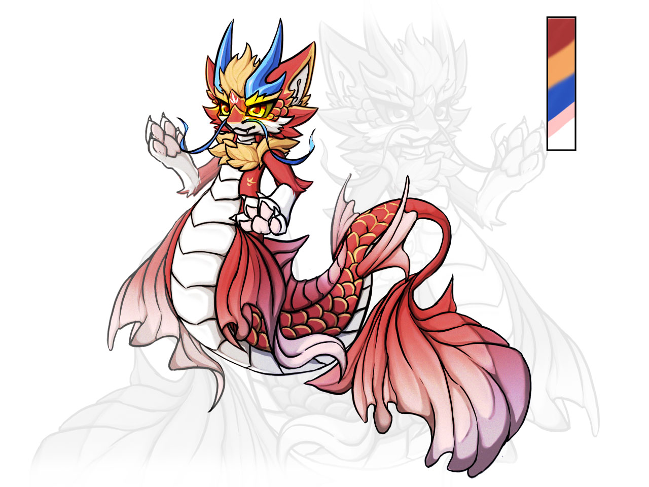 實踐隊在外形設計、配色選擇方面還查詢了大量相關資料并進行整合。為了IP形象被更多人尤其是年輕人所接受,實踐隊對當前網絡環境進行了一定的觀察,發現可愛的動物形象更容易被年輕人所接受,結合泉州“鯉城”的別稱,決定以中國傳統文化龍生九子中的第九子龍首魚身的螭吻為基礎,加上美人魚外形以及貓爪子使其看上去姿態更優美,外形更可愛。在配色選擇方面,在觀察了閩南傳統建筑常用的配色,結合泉州海上絲綢之路起點的地位,決定以閩南紅(#A73535)、刺桐黃(#F4A460)、海絲藍(#2A52BE)這三種常見的色彩為主,以白色、粉色等為輔,再結合滴水獸常見的花紋樣式進行設計。