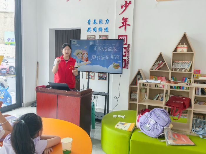 午后,“湖北精神”思政課率先開講。志愿者以“一粒花生燃星火(大別山精神)、一袋沙土筑長堤(抗洪精神)、一襲白衣護蒼生(抗疫精神)”為脈絡(luò),用故事串聯(lián)精神傳承:講大別山“紅旗不倒”的革命堅韌,展98抗洪時“人墻筑堤”的熱血震撼,憶新冠疫情中“逆行守艙”的溫暖堅守。孩子們瞪圓雙眼,時而隨紅色故事屏息凝神,時而踴躍舉手宣誓:“長大后要像抗疫叔叔阿姨一樣守大家!” 緊接著,正盜版圖書鑒別課拉開帷幕。志愿者捧來十余本對比樣本,現(xiàn)場傳授“三招辨真章”:摸紋理——正版紙張細(xì)膩柔韌,盜版粗糙發(fā)澀;辨印刷——正版字跡清晰勻整,盜版墨色暈染模糊;查細(xì)節(jié)——正版排版嚴(yán)整,盜版常現(xiàn)頁碼錯亂。“這本繪本字邊有毛邊,是盜版!”小朋友們圍攏觀察,指尖輕觸紙面,爭先指出差異,在“打假實踐”中識破偽裝。