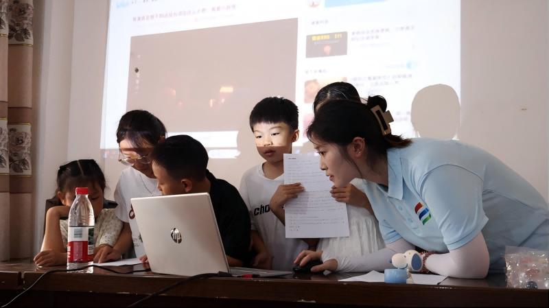(圖為實踐團成員在普通話課堂上帶孩子們進行趣味配音小游戲。譚皓澤 供圖)