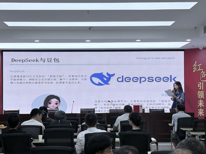 宣講圍繞DeepSeek與豆包的基層應用展開。在現場實操演示環節,團隊成員用直觀方式展示了兩款工具的高效功能:DeepSeek能通過輸入關鍵詞即時生成規范公文初稿,還可快速提煉政策文本的核心條款,拍攝紙質表格就能自動填充內容,一鍵生成中英雙語文本,讓文字工作流程大幅簡化;豆包平臺則能根據選取的信息快速生成宣傳海報設計稿,對原始照片進行智能優化可簡化老年證件辦理流程,導入破損檔案圖片能完成高效修復,團隊同時簡要介紹了它在智能安防方面的潛在應用價值。
