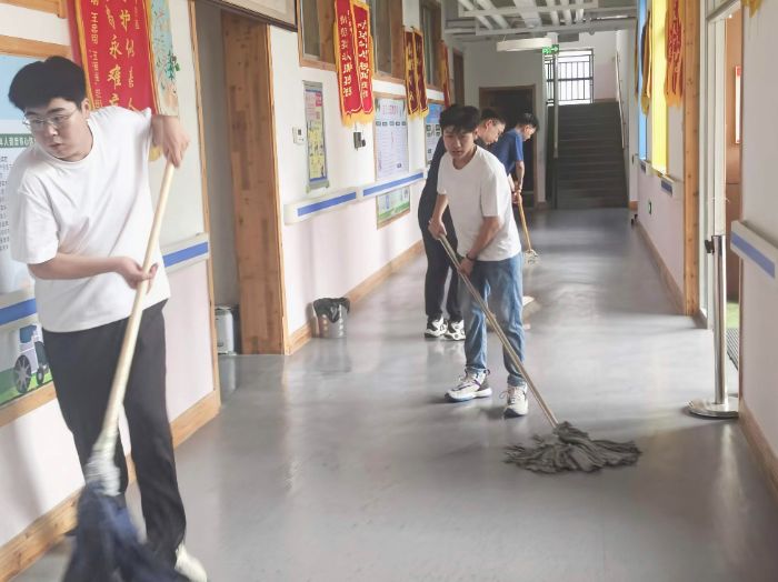 實踐初成員抵達養老院后,與院長經過對接,了解養老院的基本情況,隊員們迅速分工:有的拎起拖把,細致擦拭走廊地面,有的對活動室桌椅擦拭消毒,不放過窗臺、扶手等衛生死角。