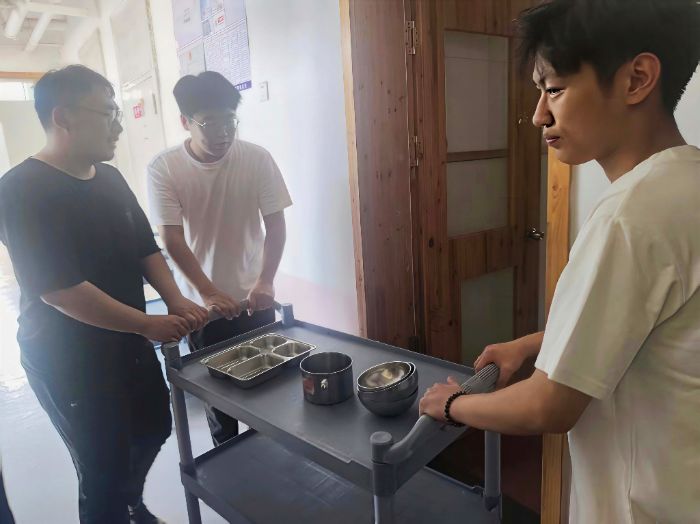 實踐期間到了吃飯時間,隊員們協助護工分裝餐食,將熱乎的飯菜逐一送到行動不便的老人房間,還貼心詢問“今天的菜合胃口嗎”。看著隊員們忙碌的身影穿梭在院中,老人們的臉上也露出了笑容。