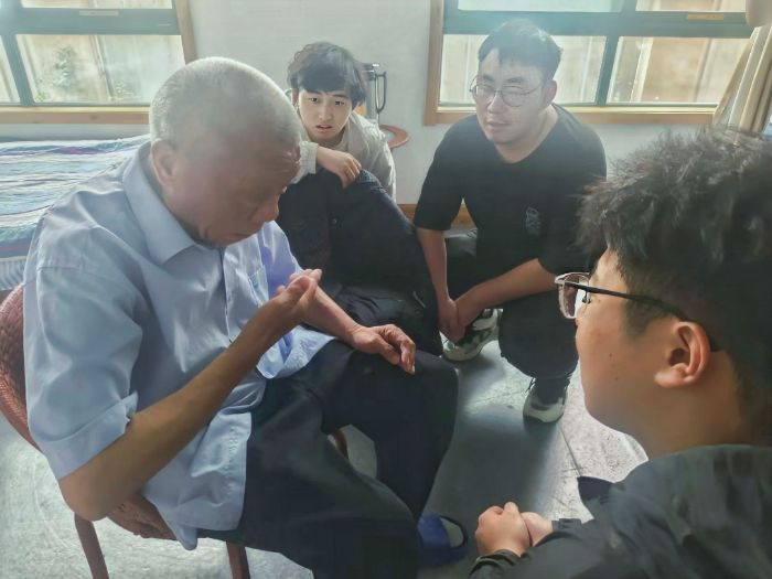 休息間隙,隊員們圍坐在七十八歲的老黨員郭爺爺身邊聊天。有著三十多年黨齡的郭爺爺,曾是縣里的老干部,談及在養老院的生活,他格外動情:“我在這住了一年半年,最佩服的就是咱們院長!她這人好心善,待我們這些老人就跟對待自己的父母一樣親。”郭爺爺回憶,院長每天來房間幫他量體溫、遞藥;院里有老人生活不能自理行動不便,院長親自幫忙翻身、喂飯。