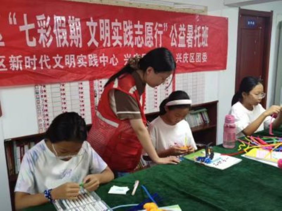 在社區服務中心,實踐團成員協助社區工作人員籌備并舉辦了“七彩假期,文明實踐志愿行”活動。實踐團成員耐心指導孩子們完成手工制作,鼓勵他們積極參與游戲,幫助他們解答知識競賽中的問題。