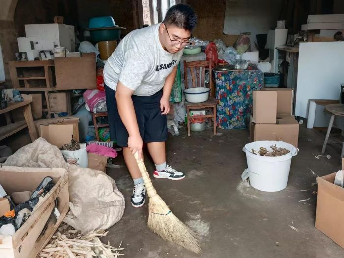 實踐團成員走進多位老人的家中,幫助他們打掃衛(wèi)生。實踐團成員用自帶的清潔工具進行全面打掃。清理庭院柴火、歸置農(nóng)具、清掃房間、擦拭家具,用兩個小時便讓原本昏暗的屋子重新整潔明亮。