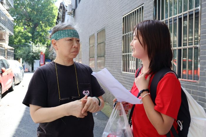 團隊分組深入社區各個角落,在老舊小區的樓道里,向正在乘涼聊天的老人發放調查問卷。調研中我們發現,老年人群體對智能手環的了解度分化程度較大。隨著手中的問卷漸漸寫滿,更清晰的答案也隨之浮現:讓智能手環真正走進老年人的生活,既需要技術向“適老”貼近,更需要像鼓樓區這樣的發達城區,在奔跑的同時不忘回頭,為老年群體搭起跨越數字鴻溝的橋梁。