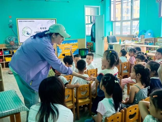 此外,隊(duì)員們還精心籌備了系列教具,走進(jìn)當(dāng)?shù)赜變簣@,以“大熊貓”為具象化載體開(kāi)展生態(tài)保護(hù)主題宣講。活動(dòng)中,團(tuán)隊(duì)結(jié)合幼兒認(rèn)知特點(diǎn)設(shè)計(jì)趣味互動(dòng)問(wèn)答環(huán)節(jié),并輔以激勵(lì)性貼紙獎(jiǎng)勵(lì),將生態(tài)文明的深層理念,轉(zhuǎn)化為孩子們易于理解和接受的童真表達(dá)。這種沉浸式的科普互動(dòng),不僅讓孩子們?cè)谳p松愉悅的氛圍中直觀(guān)理解了關(guān)愛(ài)自然、呵護(hù)生靈的重要意義,更使生態(tài)文明的種子在幼小心靈中悄然扎根、蓄勢(shì)萌芽。此次活動(dòng)為生態(tài)文明理念的代際傳遞搭建了具象化的橋梁,也為區(qū)域生態(tài)文明建設(shè)的長(zhǎng)遠(yuǎn)推進(jìn)注入了充滿(mǎn)活力的新生力量。