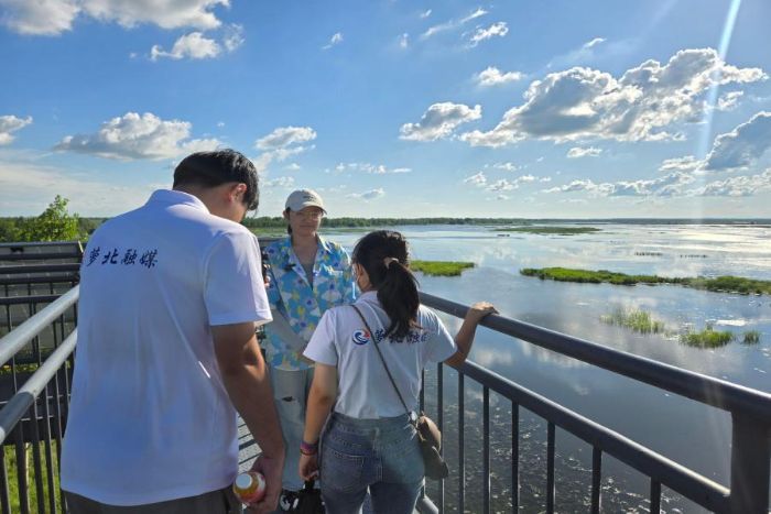 8月15日,在黑龍江流域博物館內(nèi),隊(duì)員既直觀(guān)見(jiàn)證了土壤侵蝕率持續(xù)下降、水體質(zhì)量穩(wěn)步提升的生態(tài)治理成效,亦從抗戰(zhàn)展區(qū)的英雄事跡與東北開(kāi)拓史的深厚積淀中汲取紅色精神養(yǎng)分。這一過(guò)程既強(qiáng)化了隊(duì)員對(duì)區(qū)域生態(tài)修復(fù)成果的系統(tǒng)認(rèn)知,也為團(tuán)隊(duì)凝聚生態(tài)保護(hù)的精神動(dòng)力提供了歷史參照。離開(kāi)名山島后,隊(duì)伍專(zhuān)程赴蘿北口岸及互貿(mào)區(qū),實(shí)地調(diào)研海關(guān)監(jiān)管體系與中俄貨物互通格局,在跨境貿(mào)易實(shí)踐觀(guān)察中,為探索生態(tài)保護(hù)與經(jīng)貿(mào)發(fā)展協(xié)同路徑積累了鮮活珍貴的一手素材,這些素材為后續(xù)構(gòu)建區(qū)域性生態(tài)貿(mào)易模型提供了實(shí)踐依據(jù),也為推動(dòng)區(qū)域生態(tài)貿(mào)易協(xié)同發(fā)展筑牢實(shí)踐根基。進(jìn)入嘟嚕河濕地,觀(guān)鳥(niǎo)臺(tái)可見(jiàn)東方白鸛等珍稀鳥(niǎo)類(lèi)棲息共生之景,標(biāo)本室展品則持續(xù)警示著守護(hù)棲息地的時(shí)代使命,隊(duì)員們?cè)诖擞涗浀镍B(niǎo)類(lèi)棲息數(shù)據(jù),為當(dāng)?shù)貪竦厣鷳B(tài)監(jiān)測(cè)體系補(bǔ)充了新的觀(guān)測(cè)樣本。