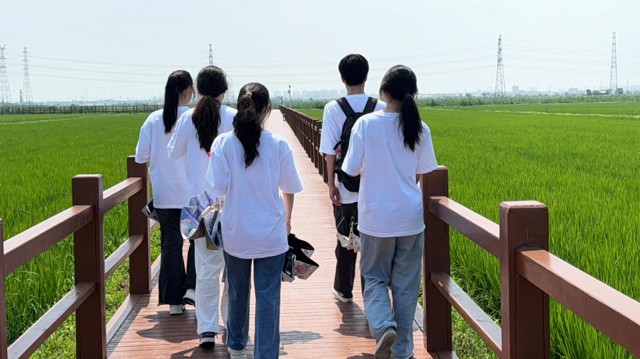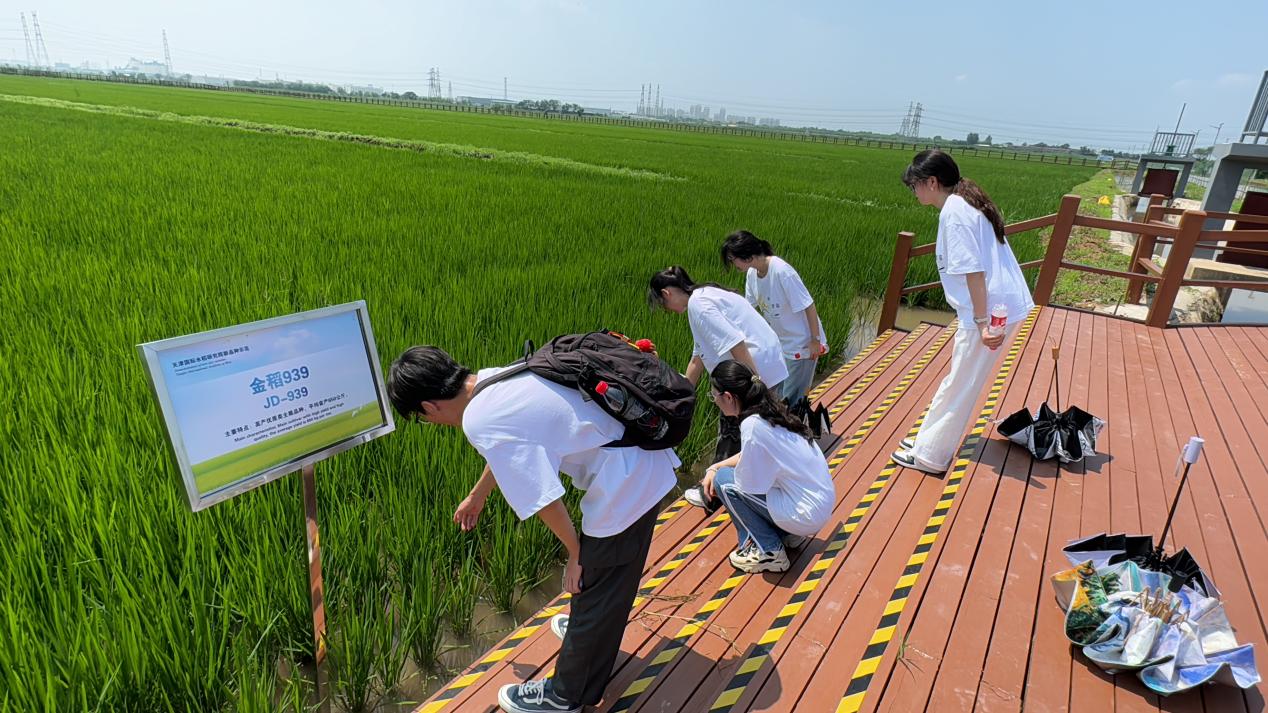 漫步棧道,實踐隊員們切實近距離地觀察到了“金稻939”的稻谷。隊員們紛紛俯身靠近田壟,指尖輕觸稻苗葉片,仔細觀察著這一優質品種的生長狀態:葉片的寬厚程度、分蘗的疏密分布、根系的扎根深度,都成為他們記錄的細節。“金稻939”作為當地農旅融合的核心作物之一,其生長態勢不僅關系到稻田畫的景觀呈現,更與產業鏈延伸的經濟效益緊密相連。圍繞三產融合中如何平衡生態保護與經濟效益、構建全產業鏈發展模式等問題,實踐隊員與當地農戶交流、實地考察求解。從稻田畫的創意策劃,到產業鏈延伸的思考,隊員們將課堂理論與田間實踐結合,觸摸到鄉村發展的真實脈搏。