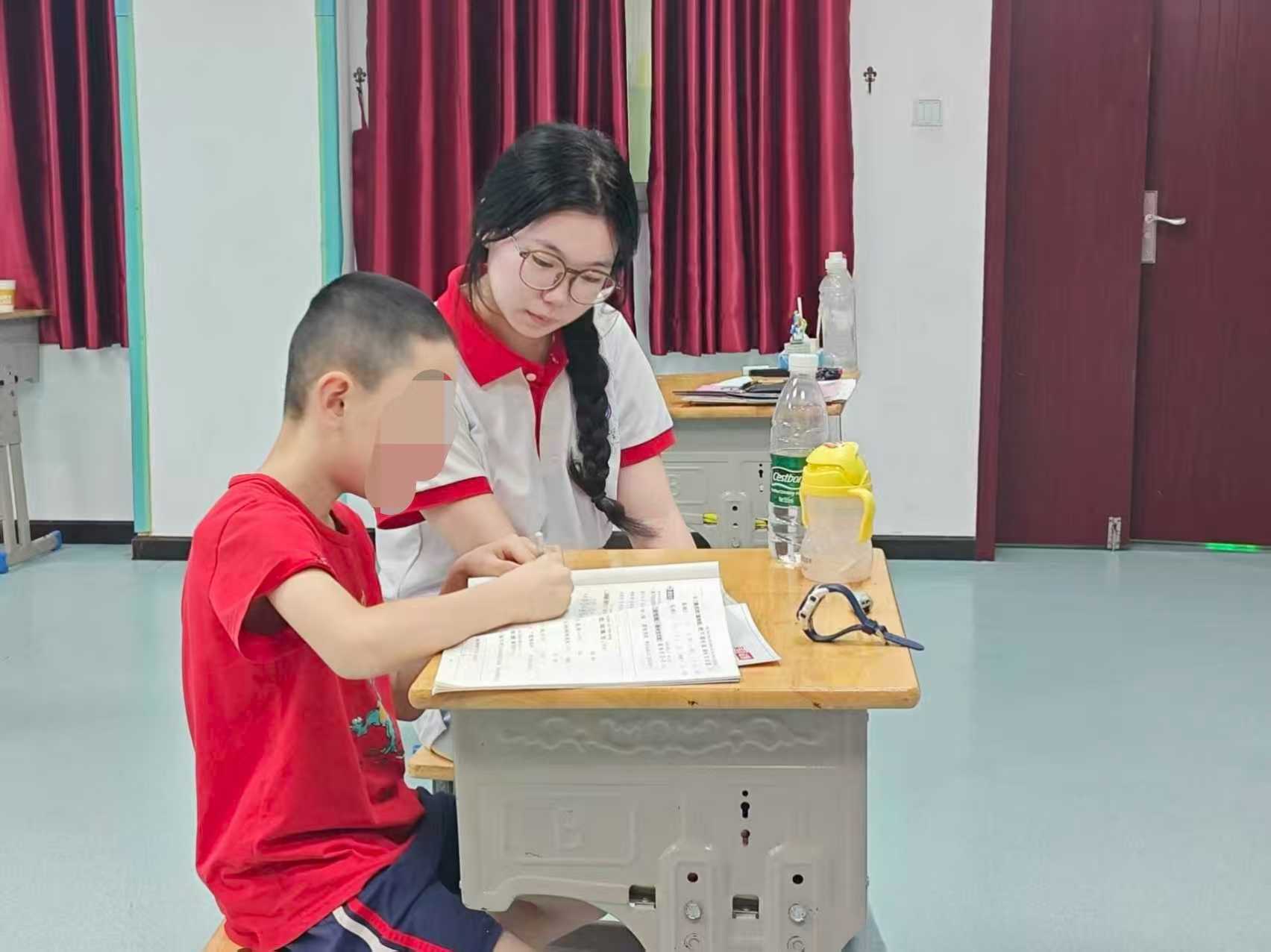 圖為“予光同行”實踐隊員輔導福利院兒童完成作業(章師琪供圖)