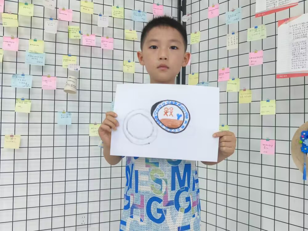 圖為一名托管班的孩子正驕傲地展示自己的徽章作品。安書鑫 供圖