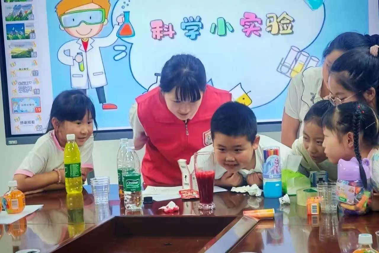 圖為實踐團成員和孩子們一起觀察火山噴發小實驗 陳欣 攝