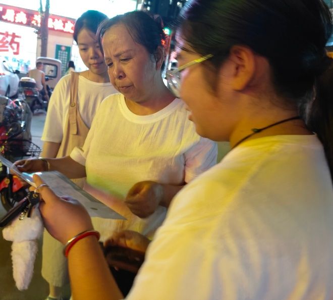 理論之后是實踐。團隊亮出傳統醫學法寶——穴位按摩。主講人羅同學展開一張清晰的人體穴位圖,聚焦腰痛“克星”:手背上的“腰痛穴”與膝后的“委中穴”。她精準示范定位方法、按壓力度(“酸脹感為宜,非越痛越好”)和按摩節奏。“哎喲,按這個地方,腰眼這里真的感覺松快一點了!”居民趙大爺在隊員一對一指導下找準穴位后,驚喜地喊出聲。現場很快變成實踐課堂,老人們兩兩結對,互相摸索、交流感受。團隊發放的《居家穴位按摩指南》圖文并茂,詳細標注了穴位圖、操作要點、每日時長等。