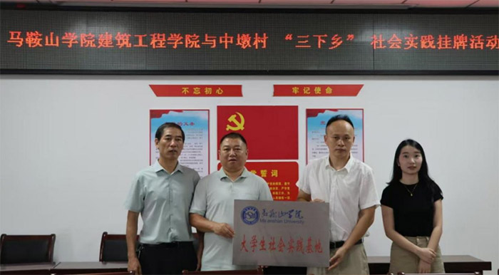 扎根鄉土:掛牌基地筑平臺,搭建橋梁聯實踐 8月12日上午,“馬鞍山學院大學生社會實踐基地”掛牌儀式在中墩村村委會廣場隆重舉行。中墩村村委副書記楊忠和、第一書記駐村工作隊隊長曹文華,馬鞍山學院建筑工程學院黨總支書記鄭選斌、輔導員楊文鈺、實踐團全體成員及村民代表共同出席儀式。