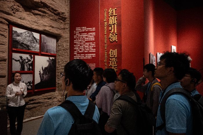 從千年文明的回響中走出,實踐團一行來到林州市紅旗渠。站在太行山懸崖邊,俯瞰那條蜿蜒曲折的“人工天河”,渠水清澈見底,順著山勢流淌,滋養著曾經干涸的土地。“數十年前,這里還是‘十年九旱、水貴如油’的地方。”紅旗渠紀念館講解員指著一幅老照片說,照片里,林縣百姓挑著水桶,在崎嶇山路上跋涉,桶里的水僅夠一家人一天飲用。走進紀念館,一組“凌空除險”的場景復原震撼了所有人:幾名修渠民工腰系大繩,懸在數十米高的懸崖上,手持鋼釬鑿石,腳下是深不見底的峽谷。“當時沒有安全繩,就用麻繩;沒有機械,就靠人力。”講解員介紹,為了在絕壁上開出渠線,300多名青年組成“飛虎隊”,在零下十幾度的寒冬里,吊著繩子在崖壁上作業,不少人手上凍裂的傷口沾了泥水,愈合后又再次開裂。實踐團成員、地理信息科學專業學生肖揚看著場景里民工們補丁摞補丁的衣服,指尖輕輕劃過展柜里的鋼釬——釬頭早已磨平,卻仍能感受到當年揮動時的力量。