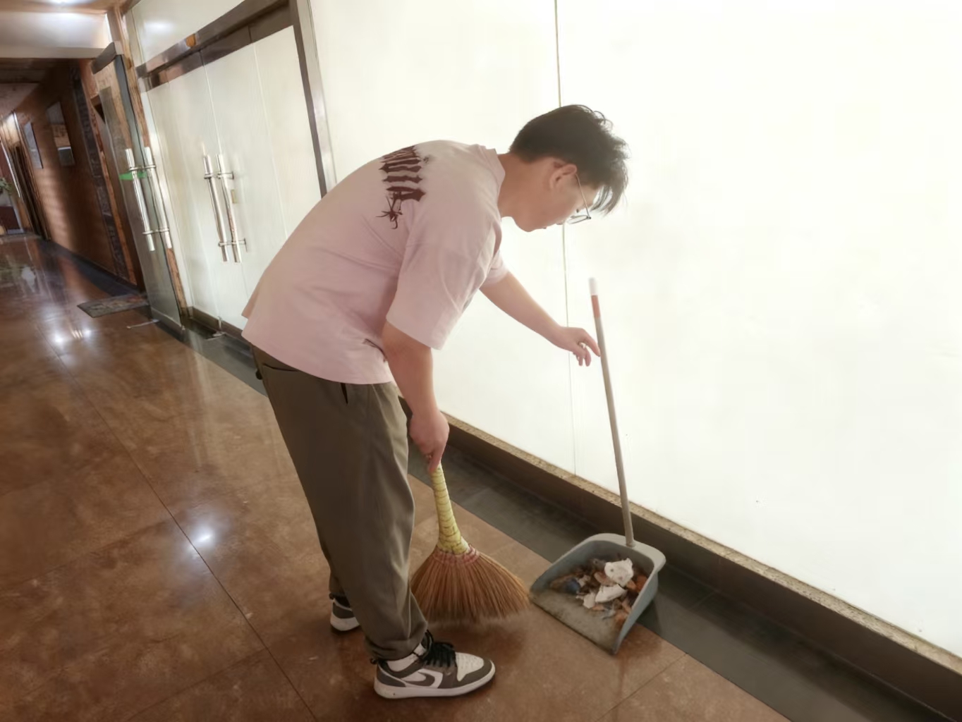 8月15日,實踐團成員最后一打掃了工作區域,對辦公室及外面的走廊進行了全面清掃,大家分工明確,有的負責清掃路面垃圾,有的專注于清理墻角的雜物,還有的則將散落的文件擺放整齊。