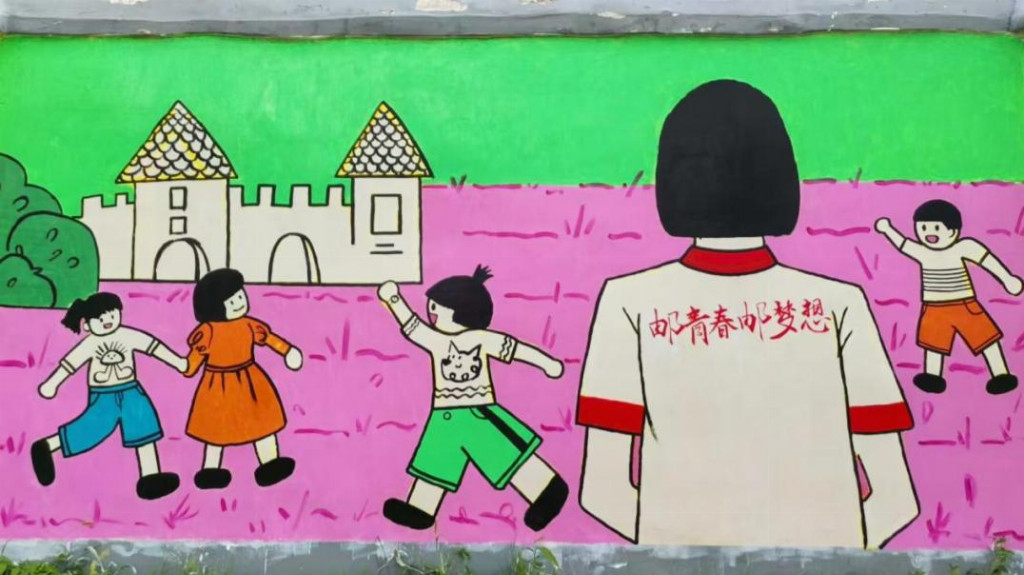 3.墻繪傳情鄉野煥彩 團隊的實踐延伸至課堂之外。成員們將環保理念融入藝術創作,精心繪制了五幅主題墻繪。成員們以斑駁墻面為畫布,將生態保護的深刻理念、鄉村美育的實踐探索與支教行動的溫暖成果熔鑄于筆墨色彩之中:翠竹搖曳、遠山含黛、古亭矗立的畫面,暈染著中國傳統美學的雅致韻味,讓鄉村文化氛圍在藝術浸潤中愈發醇厚;海洋生靈嬉戲共生的圖景將海洋生態保護的重要性娓娓道來;憨態可掬的大象與自然相融的形象,巧妙傳遞著人與自然和諧共生的美好倡議;支教師生相擁歡笑的場景被定格,成為鄉村教育振興路上閃光的記憶碎片;鋪展開來的斑斕山水畫卷,則與“綠水青山就是金山銀山”遙相呼應,生動勾勒出車門鄉生態宜居的美麗鄉村新貌。這些墻繪將成為鄉村傳播環保理念的生動載體,助力深化應對氣候變化、保護地球生態環境、促進人類社會可持續發展的實踐。