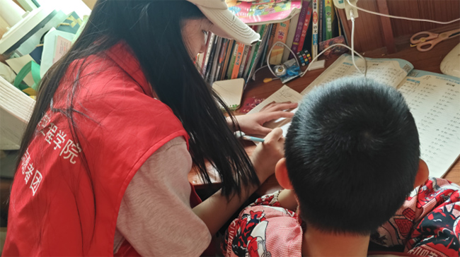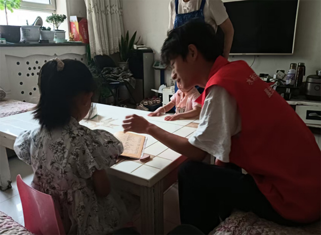 (圖為志愿者輔導孩子作業 閆耀璞 供圖)