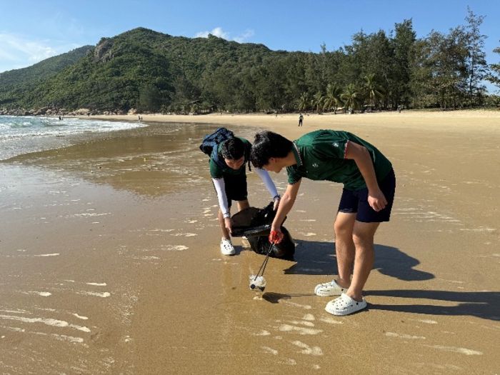 圖為實(shí)踐團(tuán)成員在尖嶺沙灘進(jìn)行凈灘行動(dòng)。楊雅雯 攝