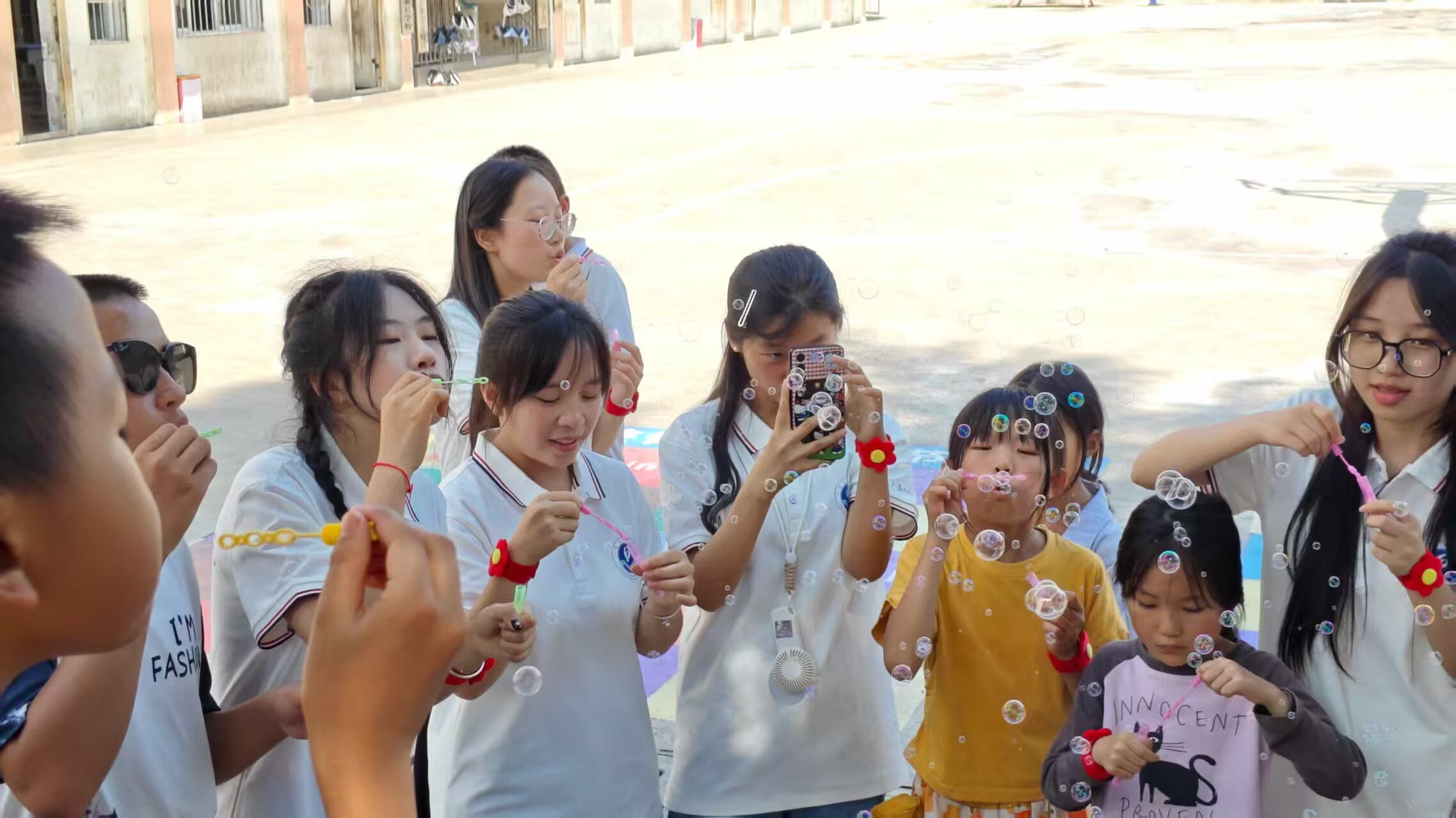 圖為校園的操場上,學生與志愿者一起快樂地吹著五彩的泡泡,泡泡在陽光下輕盈飛舞。 通訊員張晏楺 攝