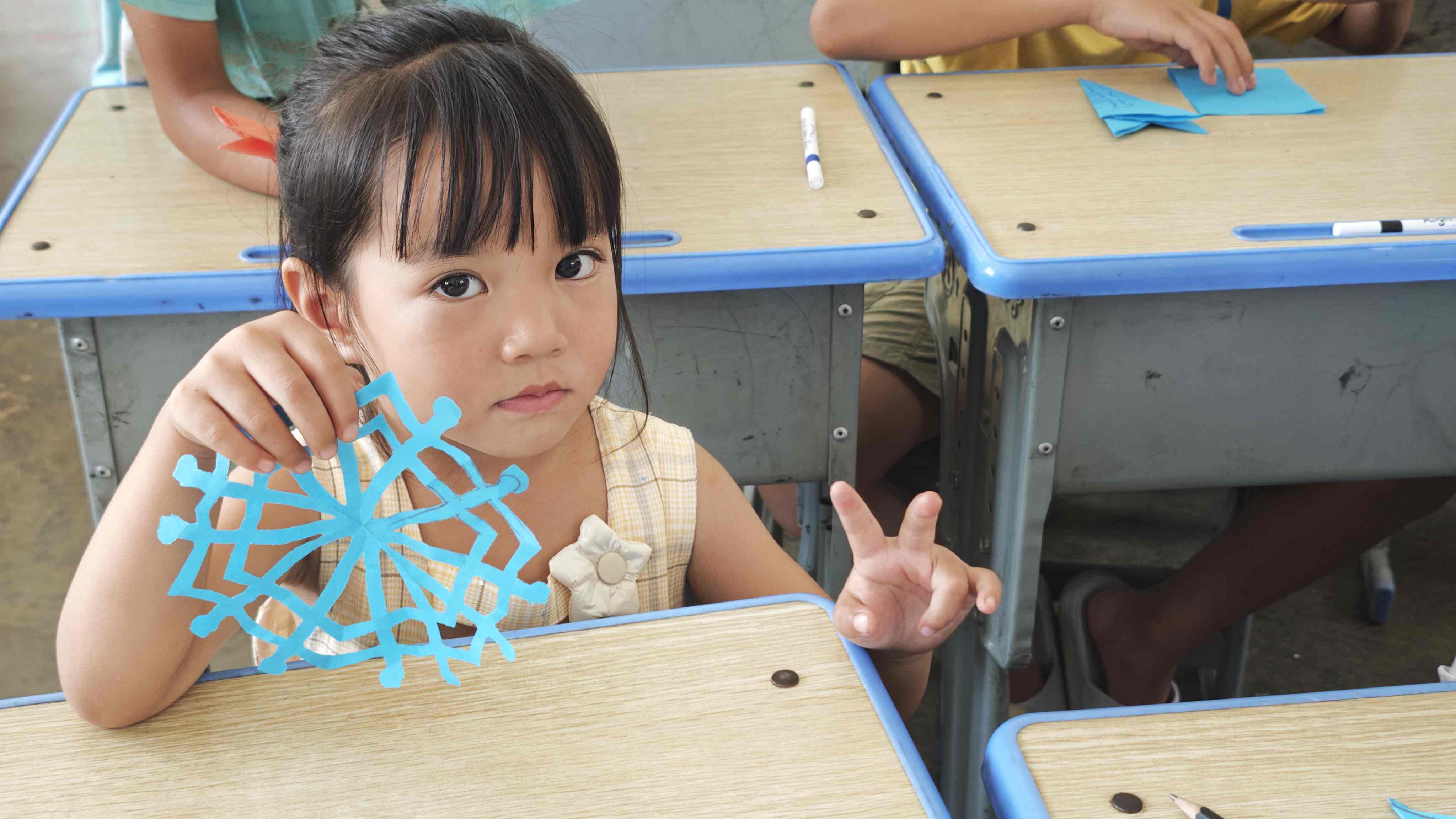 圖為剪紙課上,學生興奮地展示剪紙課成品。 通訊員李慧 攝