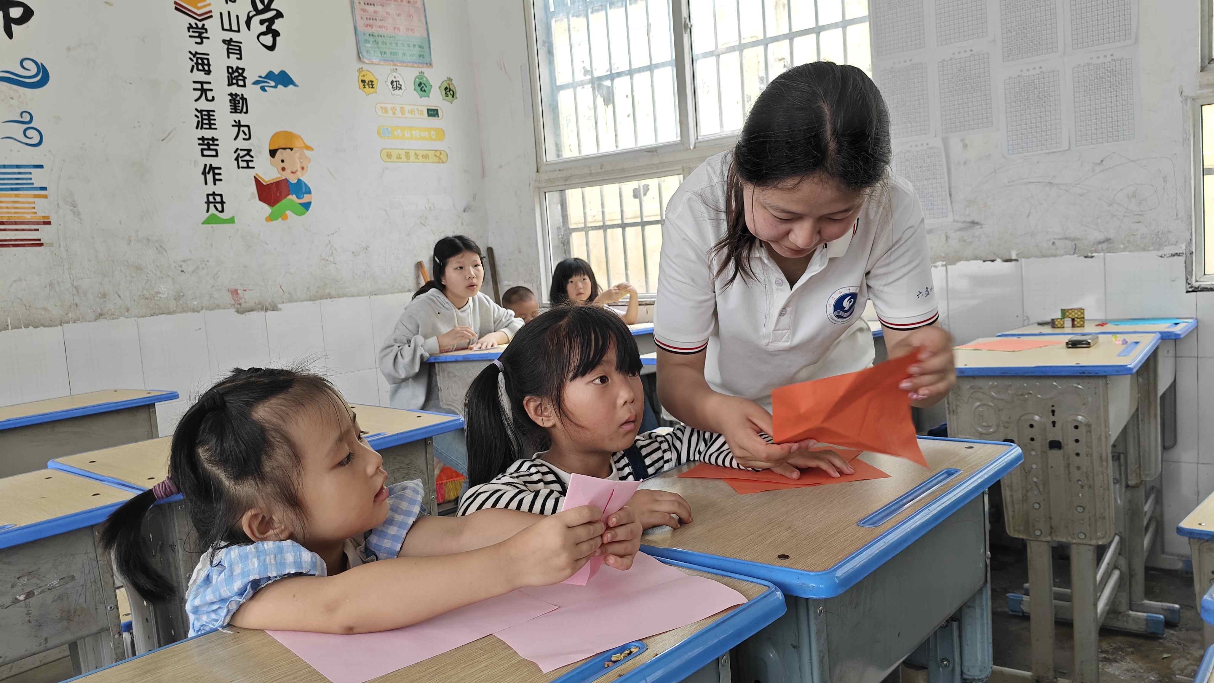 圖為手工課上,志愿者耐心指導,同學們在妙手生花的折紙課上折出了一個個精致的作品。 通訊員王靜月 攝