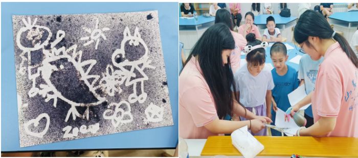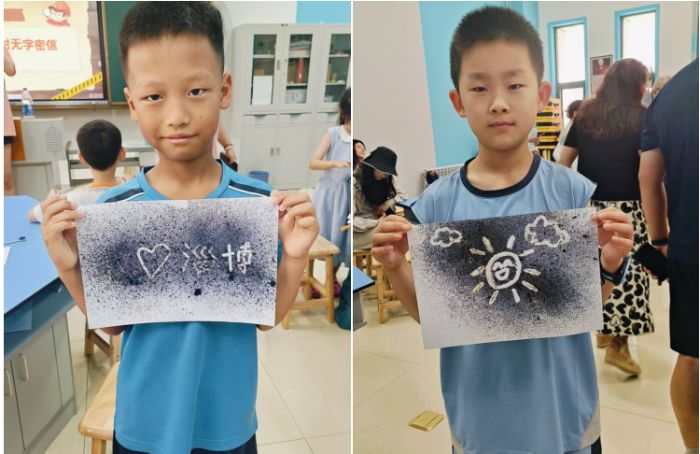 志愿者們提前準備好維C溶液,小朋友們用棉簽小心翼翼涂紙,看著紙面被維C水透過,專注地在紙上畫圖案,有的畫星星,有的寫“科學超好玩”,寫完后小朋友們都好奇地問“接下來會怎樣”。這時一旁的志愿者開始拿著提前稀釋好的碘伏溶液往紙上噴,整張白紙幾乎都變了顏色,但是寫字的地方卻維持原狀,而且小朋友們的字也顯現出來了,小朋友們驚喜得拍手,圍著志愿者們追問原理。這時志愿者老師解釋說維C的還原性讓碘單質“變色”,他們像發現寶藏,高興地拉著同伴分享。