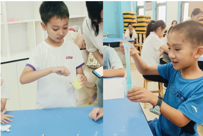 小朋友們圍在桌前,盯著白膠、清水等材料,眼睛里滿是期待。按照步驟,把白膠和清水1:1混合,加入洗潔精和甘油后,就開始使勁攪拌。有的小朋友力氣小,攪拌得臉蛋通紅,卻一刻不停,嘴里念叨著“怎么還不起泡呀”。等攪拌到起泡,倒入硼砂溶液時,大家又緊張又興奮,小心翼翼倒著、攪著,看著膠體慢慢變稠。做成后,小朋友們迫不及待伸手去扯,感受氣泡膠的彈性,有的把它拉得老長,像拉面一樣,笑著喊“看我的超級長面條”;有的使勁揉捏,聽膠體發出“咕嘰咕嘰”聲,樂得直拍手。有彈性是因為硼砂和膠水形成了交聯結構,把普普通通的材料變成有趣的小玩具。小朋友們玩得停不下來,你拉我的、我揉你的,滿屋子都是歡快的笑聲,沉浸式感受自制氣泡膠的奇妙,在摸、拉、吹中,把科學原理變成了實實在在的快樂。