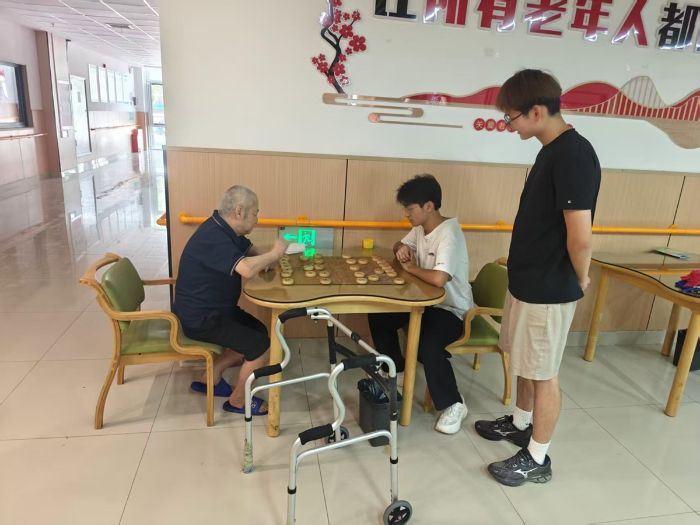 實踐團成員們還和老人進行下棋活動,在關愛老人的同時還讓歡聲笑語充滿整個養老院。棋盤上老人沉穩,下棋步步穩健;成員機智敏捷。雙方你來我往,樂在其中。