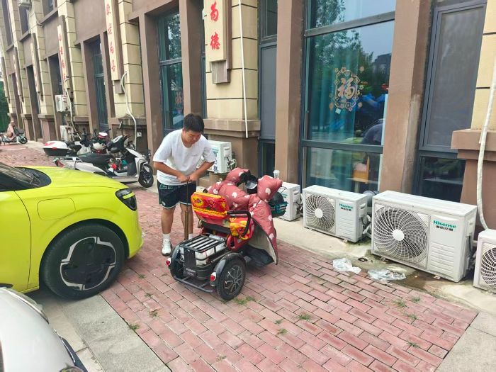 在實踐過程中,成員們還為老人們解決生活問題。有一位老人的三輪車車胎沒氣了,實踐團成員就給車胎打氣,方便了老人的日常生活,讓老人們更加便利。