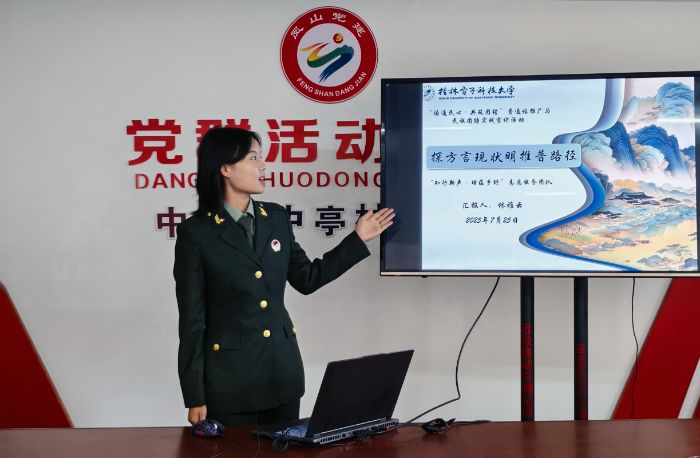 二、聚焦語言推廣,系列活動助交流 7月23日,志愿服務(wù)隊在鳳山縣中亭村開展了系列推普活動。面向參加活動的青少年開展“探方言現(xiàn)狀明推普路徑”活動,通過介紹團隊與主題、解讀推普政策、展示相關(guān)案例、開展“方言盲盒挑戰(zhàn)”等,闡述了推普目標(biāo)。并繼續(xù)舉辦“以賽促學(xué)文化共生”活動,通過繞口令比拼、情景對話初賽選拔,以及“普通話與家鄉(xiāng)發(fā)展”主題即興演講決賽,賽后還進(jìn)行了方言教學(xué)交流。針對發(fā)音問題較少的青少年群體開展“青少語培寓教于樂”活動,在趣味活動中糾正青少年發(fā)音問題。
