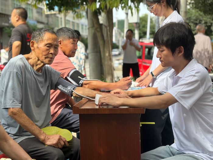 在杉林灣村,隊(duì)員們深入農(nóng)戶,開展健康問診和生活習(xí)慣調(diào)研,面對(duì)面發(fā)放《農(nóng)村健康生活指南》,重點(diǎn)科普高血壓、糖尿病等慢性病防治知識(shí),提出飲食與作息建議,并為村民免費(fèi)測(cè)量血壓、血糖等指標(biāo)。村民親切地表示:“這些大學(xué)生娃娃不僅細(xì)心熱情,還用通俗的話教我們?cè)趺答B(yǎng)生,真的把我們放心上了。”在村委會(huì),團(tuán)隊(duì)面向兒童開展防溺水、防暑降溫安全教育主題宣講,深入講解夏季高發(fā)意外的預(yù)防知識(shí),并為50余名少年兒童開展簡(jiǎn)易健康檢測(cè)和現(xiàn)場(chǎng)問答互動(dòng),寓教于樂,反響熱烈。團(tuán)隊(duì)還結(jié)合中醫(yī)專業(yè)所長(zhǎng),為村民普及適合老年人的中醫(yī)穴位保健知識(shí),講解如頭暈、咳嗽、風(fēng)濕疼痛等常見問題的