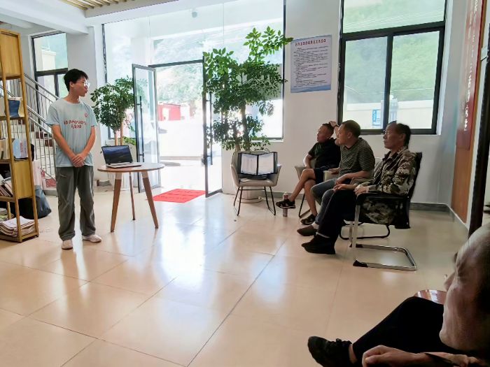 離開氣象局,實踐團來到冕寧縣彝海鎮,將腳步踏入鄉村基層。入戶走訪時,村民們分享了觀云識天、觀星預判天氣的經驗,團隊現學“卡莎莎(感謝)”等彝語搭建溝通橋梁;調研發現,當地在2020年“6·26”山洪后,已構建“藍、黃、橙、紅”四級預警響應機制。當收到氣象局發布的預警后,村里能通過微信群快速組織村民轉移至備有物資的避難場所,形成了高效的應急閉環。隨后在鎮上的科普活動中,團隊結合彝族氣象諺語與現代科學,用漢彝雙語講解災害避險知識,演示手機查詢預警的方法,分享成功避險案例,切實增強了村民的防災意識。