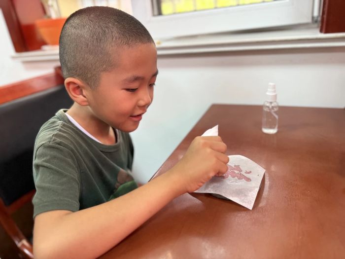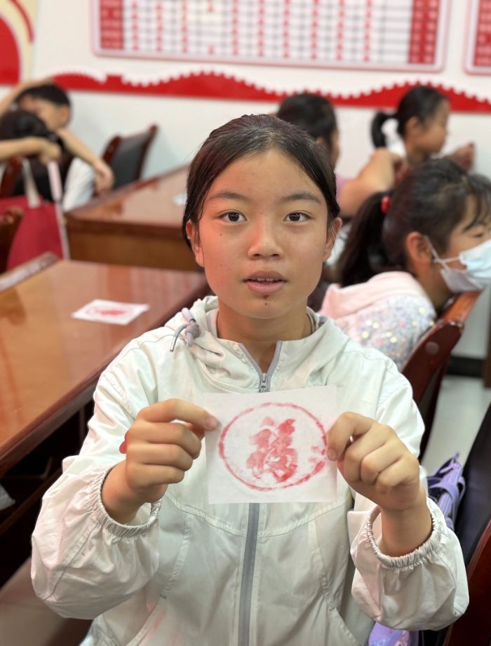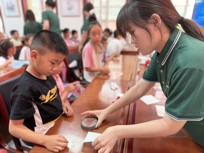 非遺拓印·墨香傳韻 。孩子們親手體驗非遺拓印技藝,墨香氤氳中感受傳統魅力。志愿者引導他們用標準的普通話描述拓印圖案、敘述圖案背后的故事,讓語言規范在實踐中生根。
