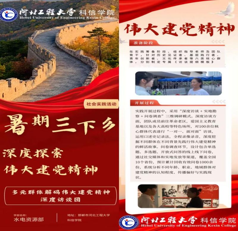 為引導大學生在實踐中傳承偉大建黨精神、厚植愛國主義情懷,河北工程大學科信學院“多元群體解碼偉大建黨精神深度訪談團”以“探尋精神之源,傾聽時代回聲”為主題,開展暑期“三下鄉”實地訪談社會實踐活動。團隊針對紅色場館游客、工作人員、青年大學生、老黨員、中小學生等多類群體定制專屬《訪談提綱模板》。實踐團以訪談記錄與多元傳播為手段,解碼偉大建黨精神,分別從以下方面具體開展:一、實地紀實訪談;二、紅色教育基地講解;三、編撰研究報告與實錄冊,開設微信公眾號專欄推送解讀長圖;打造《偉大建黨精神解碼手冊》,投放至相關場所作為實體載體;四、偉大建黨精神社會調研。在實踐中筑牢信仰之基、補足精神之鈣,爭做傳承紅色基因、矢志報國的新時代青年。