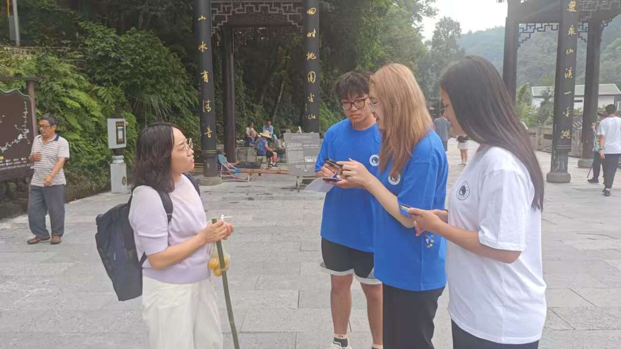 調(diào)研首站,團隊來到了峨眉山標(biāo)志性景點之一的清音仙境景區(qū)門口。這里流水潺潺、古木參天,既是游客感受峨眉山“清音繞耳、仙境入懷”的熱門打卡地,也是了解大眾對峨眉山自然資源認(rèn)知的重要窗口。團隊成員提前設(shè)計了涵蓋“峨眉山自然資源類型認(rèn)知”“生態(tài)保護參與意愿”“景區(qū)資源利用建議”等維度的調(diào)查問卷,在景區(qū)入口處設(shè)置